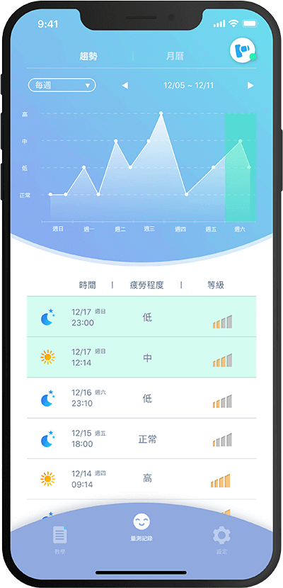及 獨家的演算法,進而分析出疲勞等級。